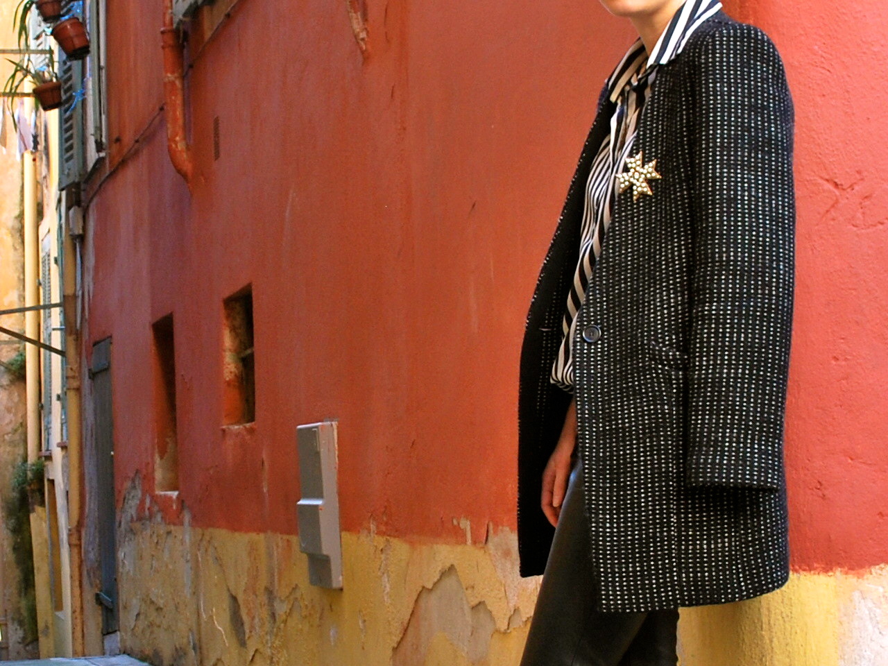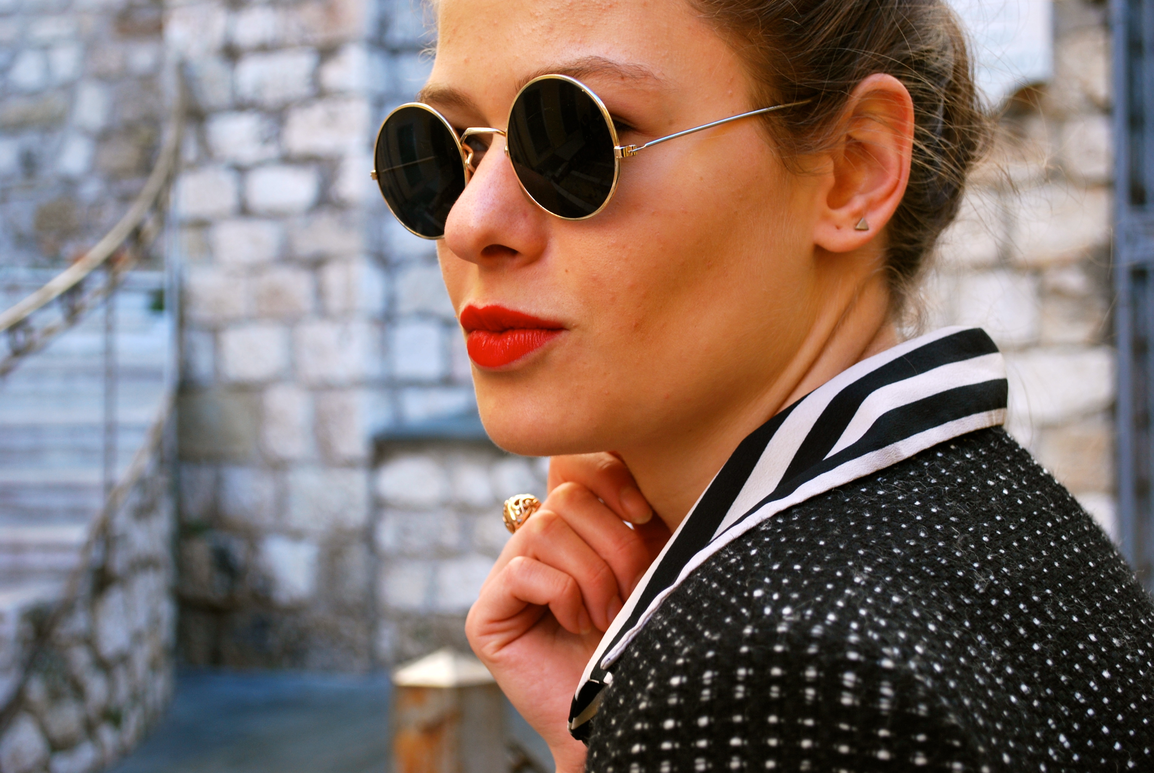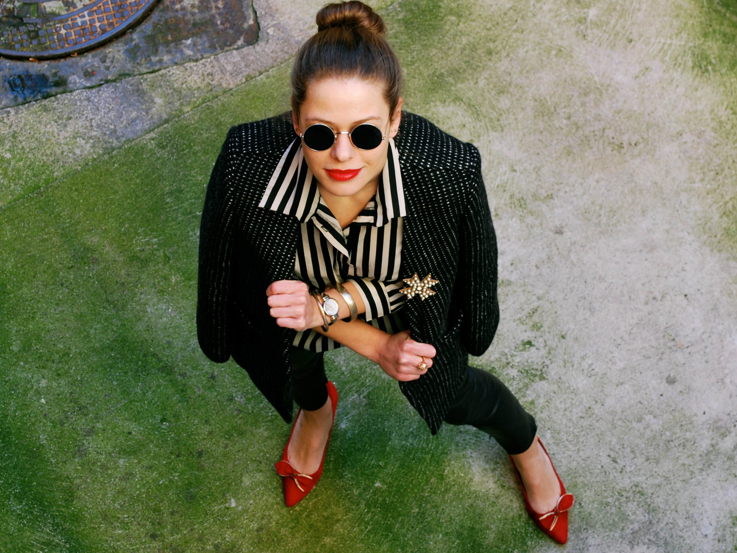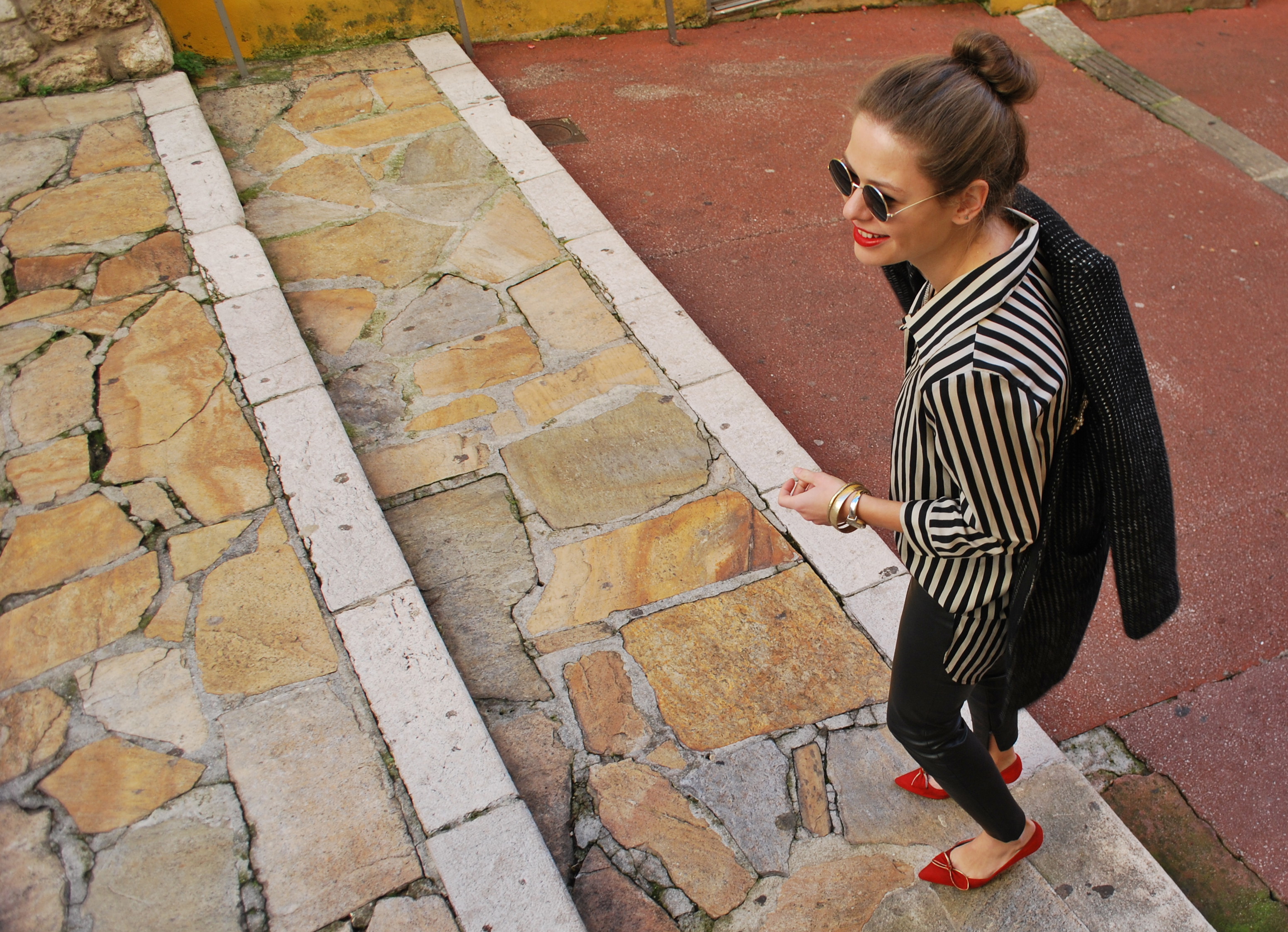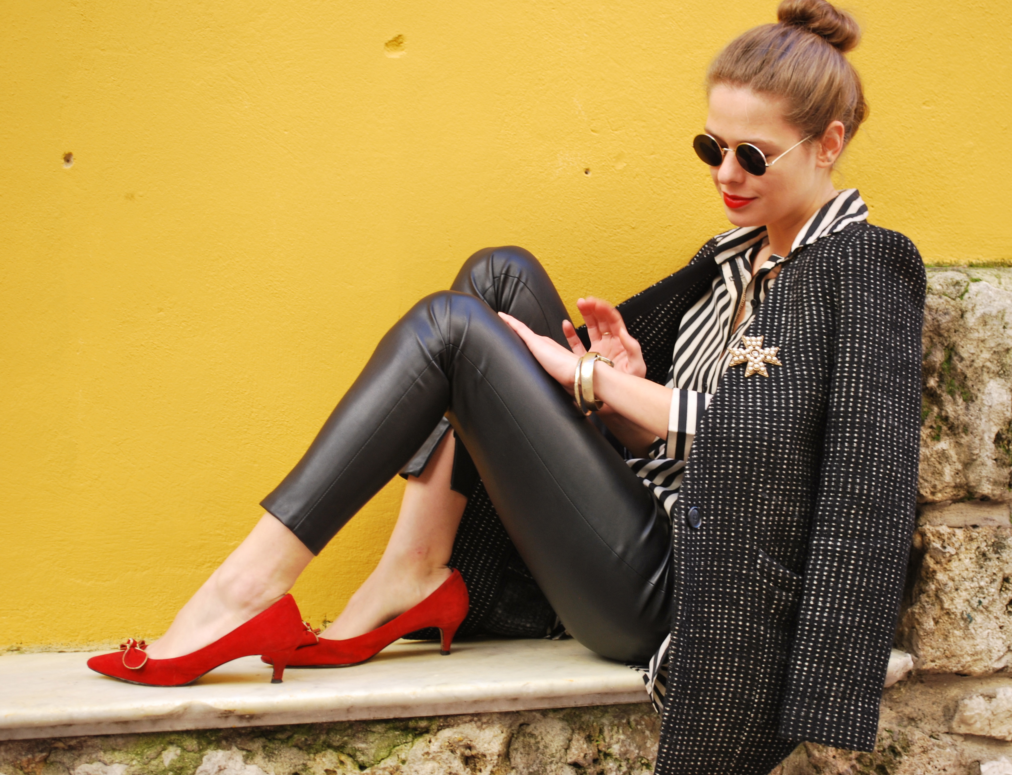 My mother often tells me I wear too much black. She urges me to play a bit with color. Every now and then, I oblige. Exhibit A, pointy red heel. Exhibit B, striking red lip. It may not be much, but I do believe it goes a long way. The elegance and power exuded by the black, the boxy/oversized coat, and the harsh vertical stripes are perfectly complemented by the romantic, passionate vibes emitted by the pops of red. And, given that the bossy romantic in me is described quite well by this attire, I am inclined to suggest that clothes speak louder than words.