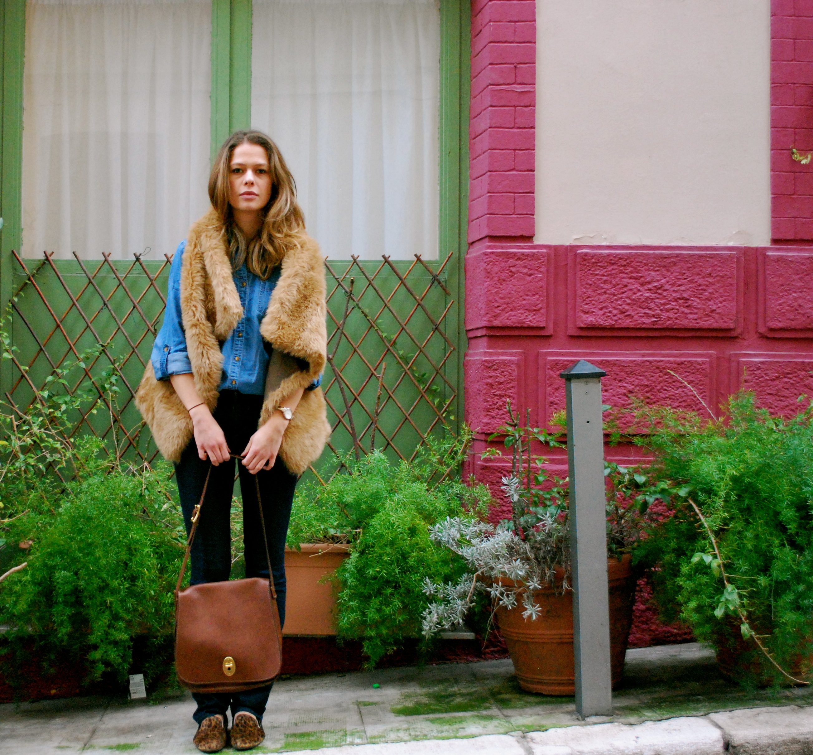 Yet the star of this post is by no means the denim². Let me direct you towards the little brown bear in the room. This boxy Zara fur vest, although a few seasons old and borrowed from my friend’s closet, is what I centered my outfit around. And if you haven’t seen the fur-tastic Topshop collection at the ongoing LFW, I am here to announce that fur will be sticking around, at least for another season.