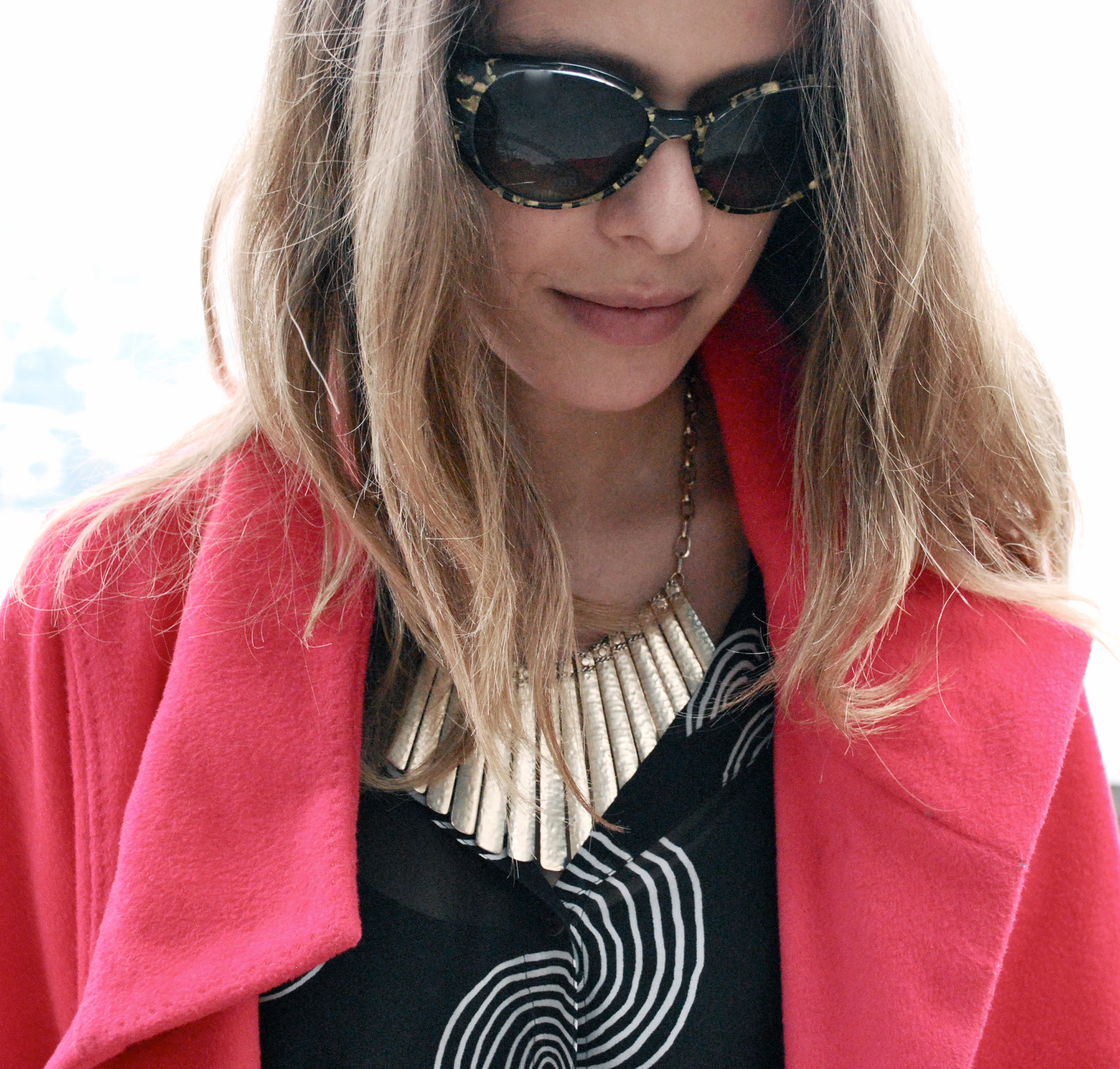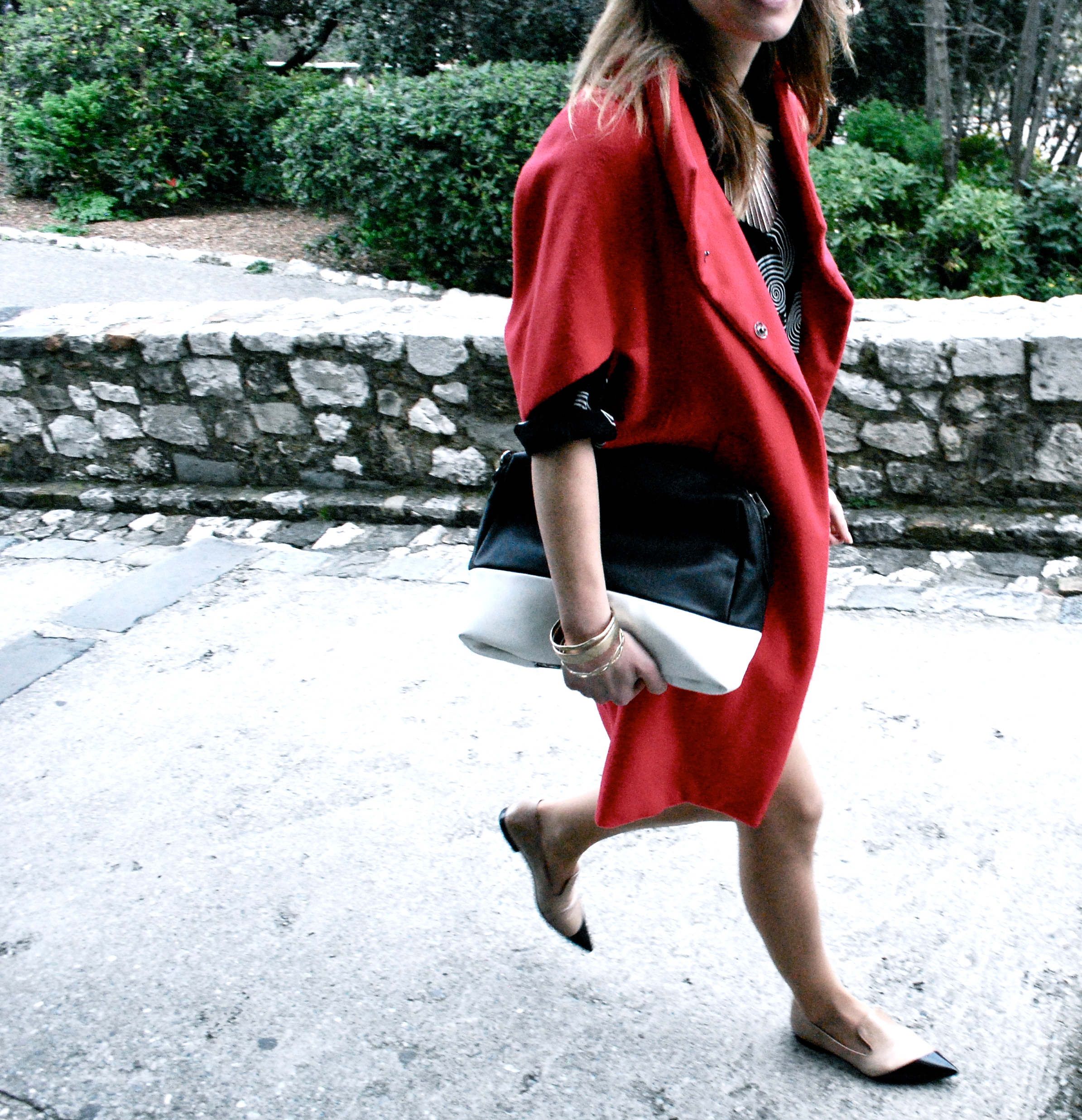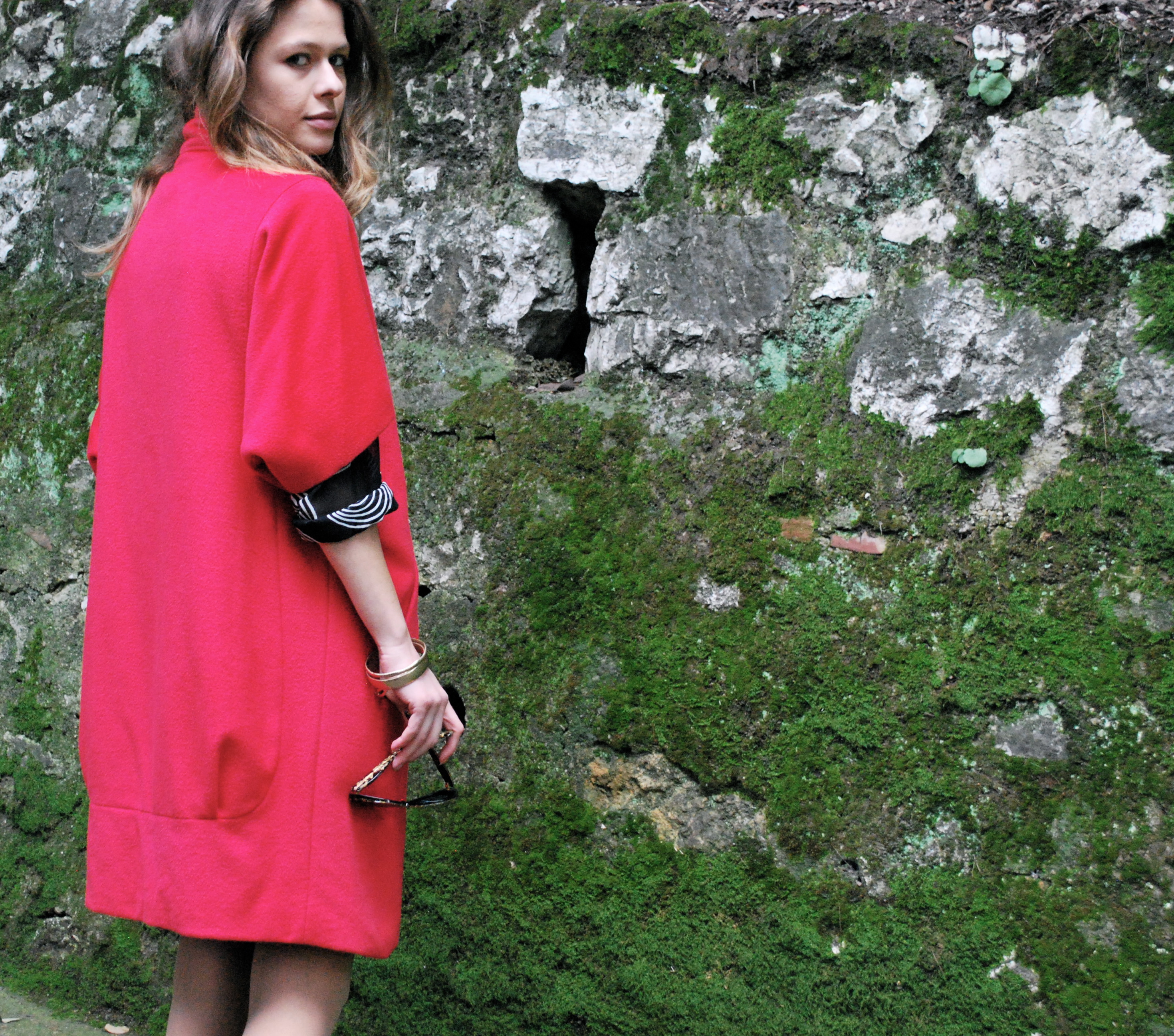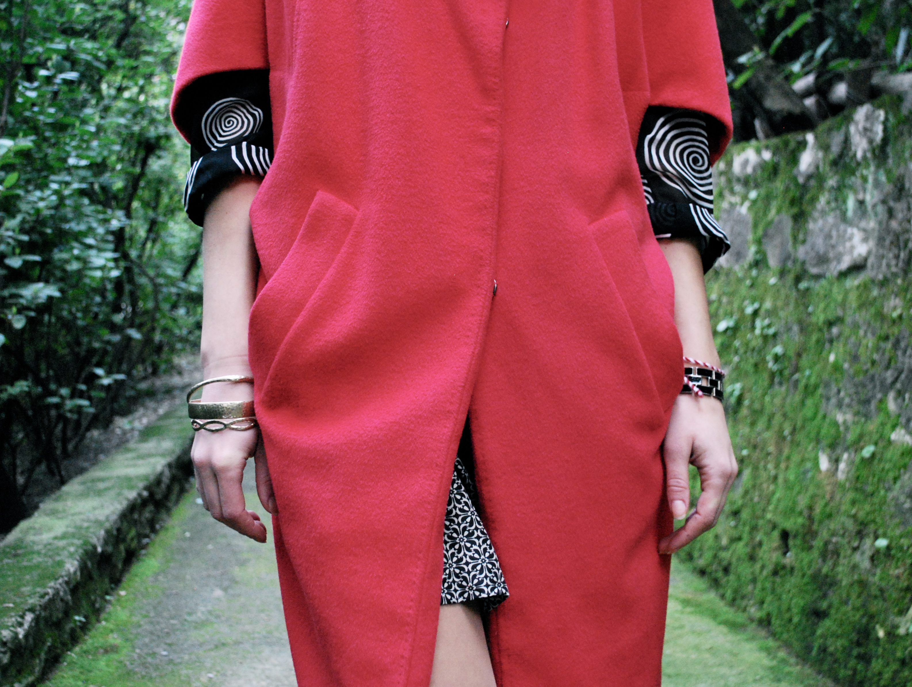 Mismatched monochrome patterns, gold hardware, and a hot pink, chic version of a snuggy – my way of welcoming the long-awaited spring weather. My brief Little Red Riding Hood moment should surely please Mother Nature, unless perhaps she disapproves of my pointy color-block flats stepping all over her fresh greenery. Oops.