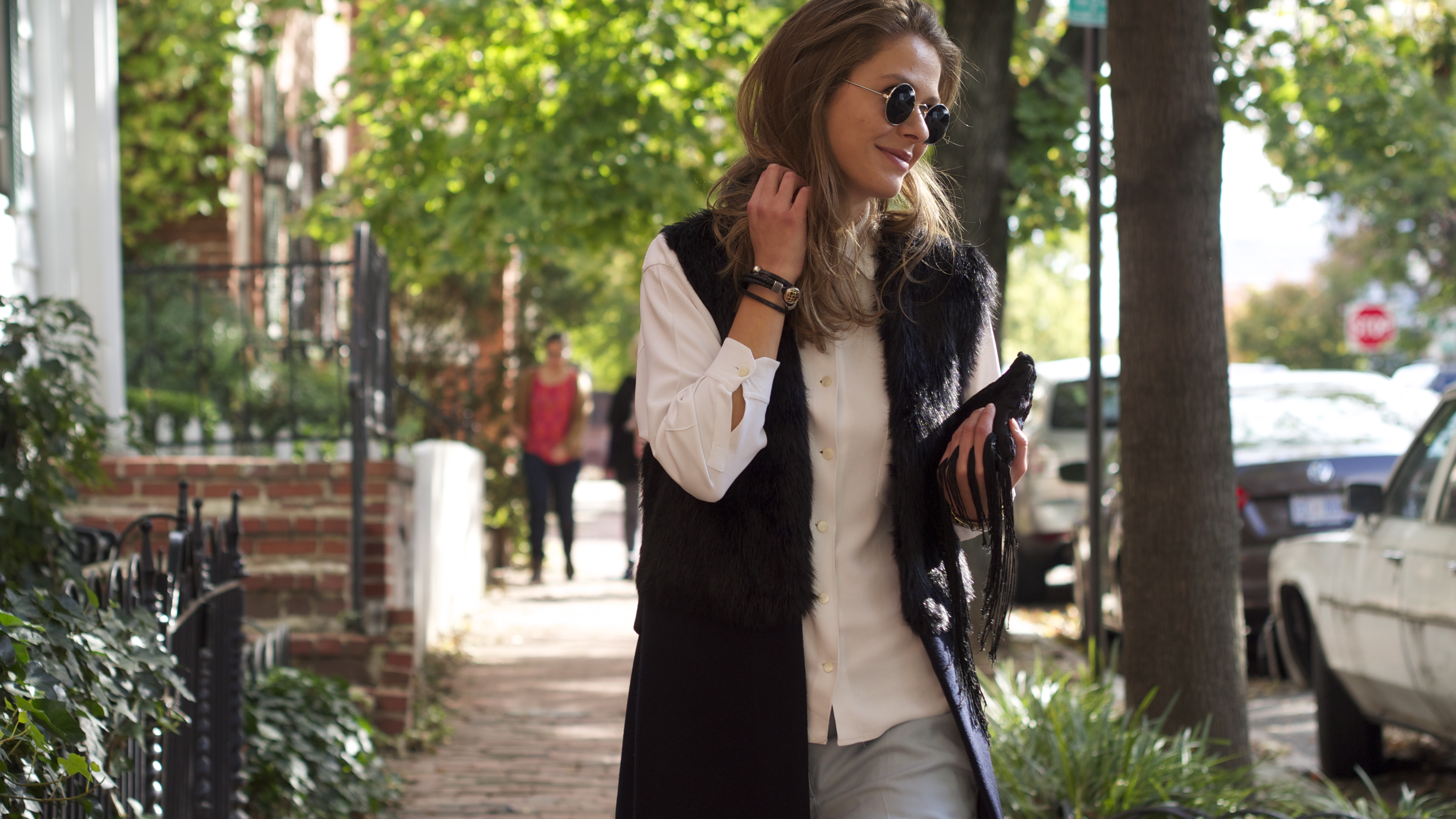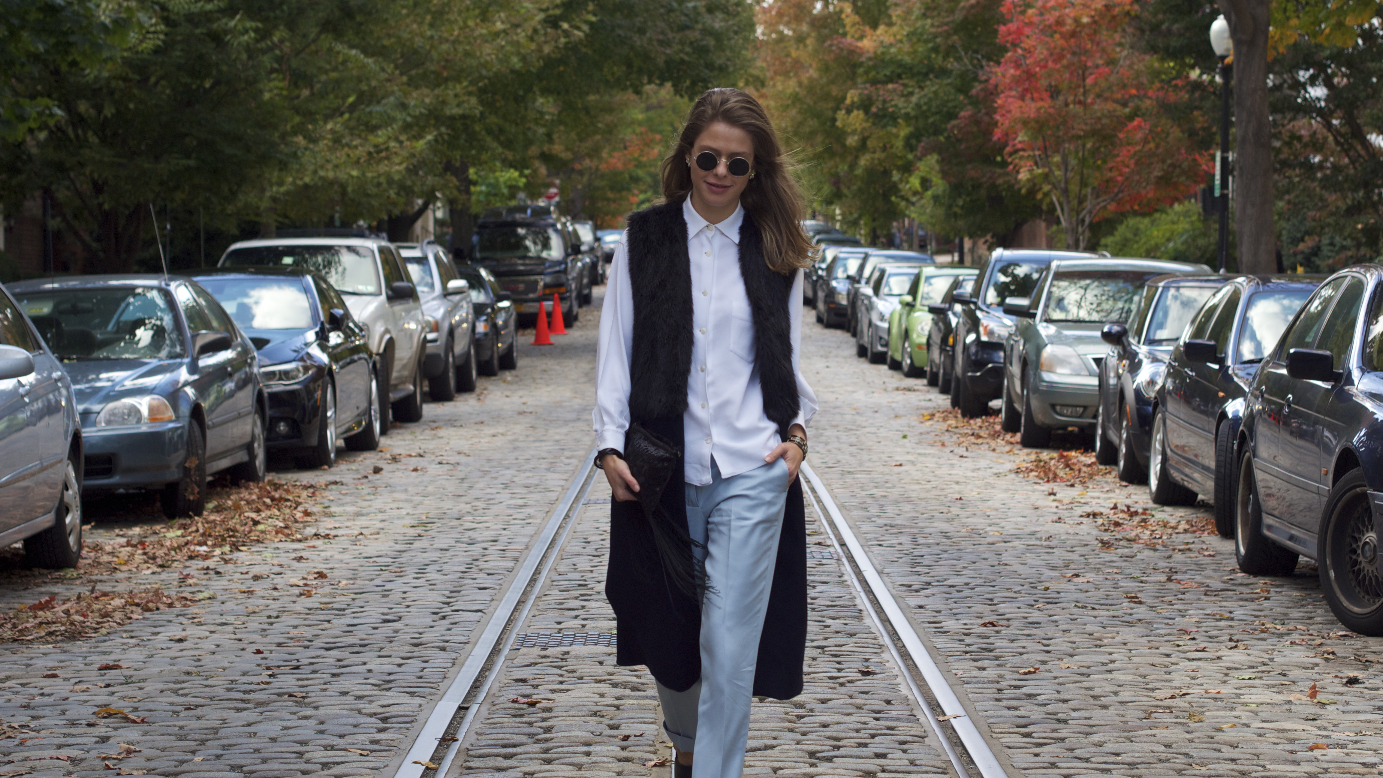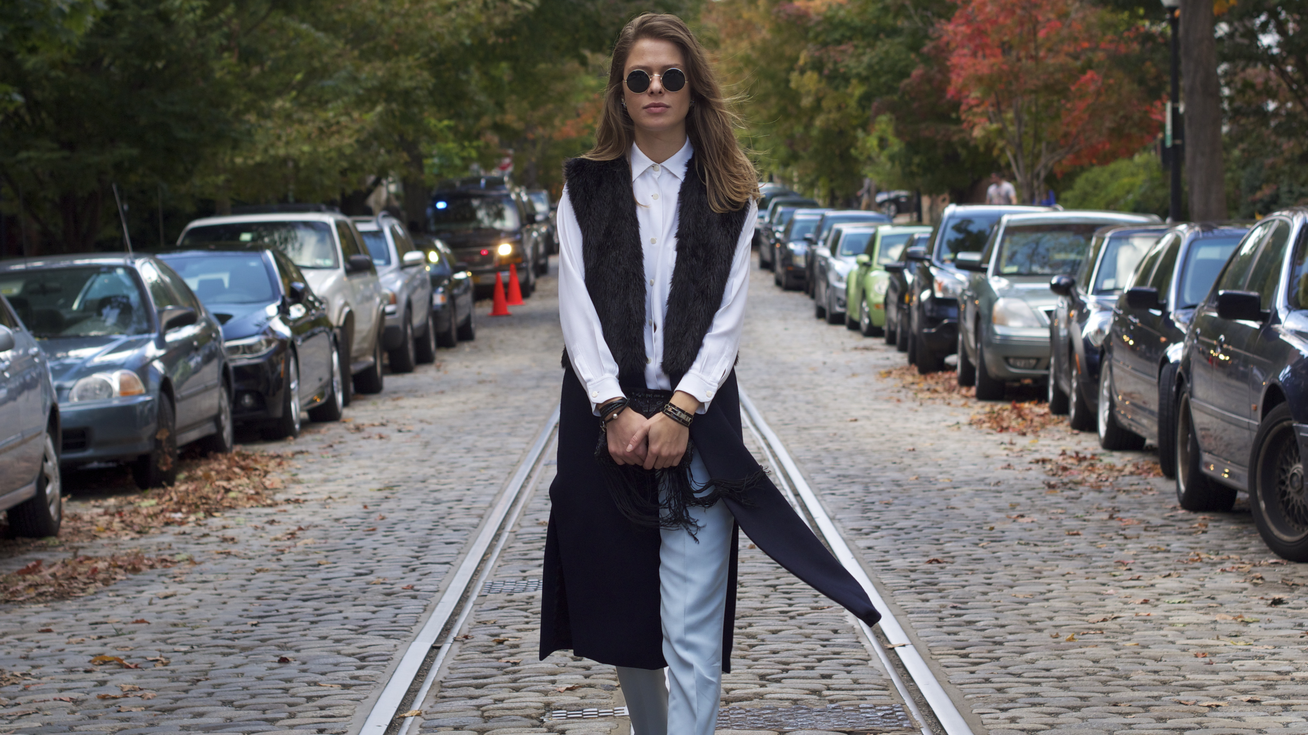 Zara Sleeveless Coat || Max Mara Vintage Button Up || Stella McCartney Trousers || Chico’s Fringed Bag || Enzo Angiolini Booties