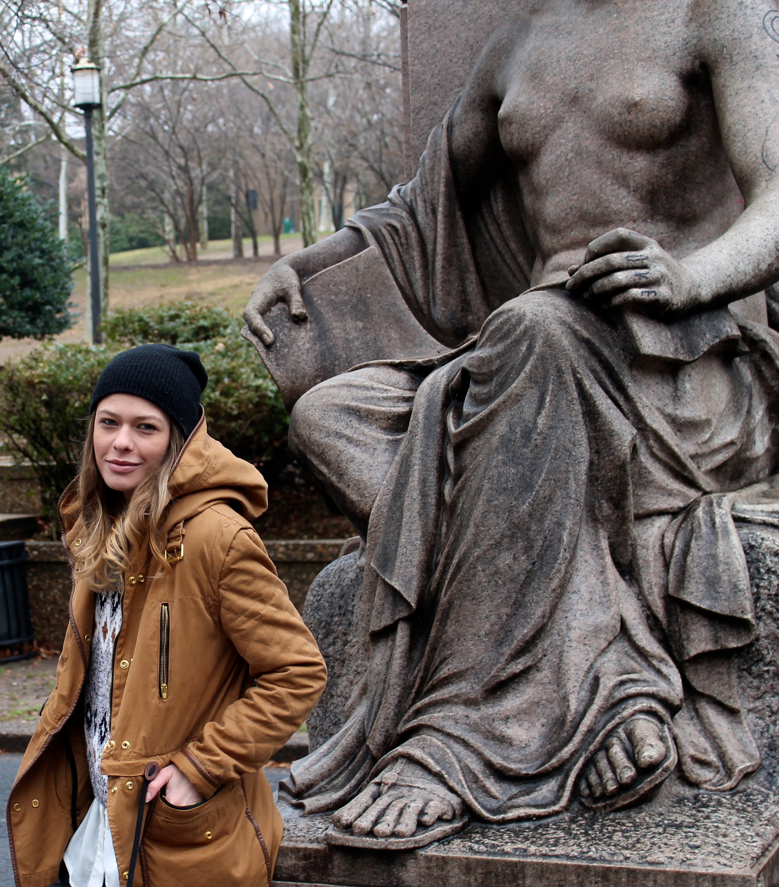 Today’s special: one part faux leather, one part silky button up, topped with a chunky knit, and finished off with a hooded parka. An added benefit to this coat, amazing zip detail aside, is the faux fur lined interior, which makes it my second favorite approach to staying warm during the frigid winter months – the first being actual human contact.