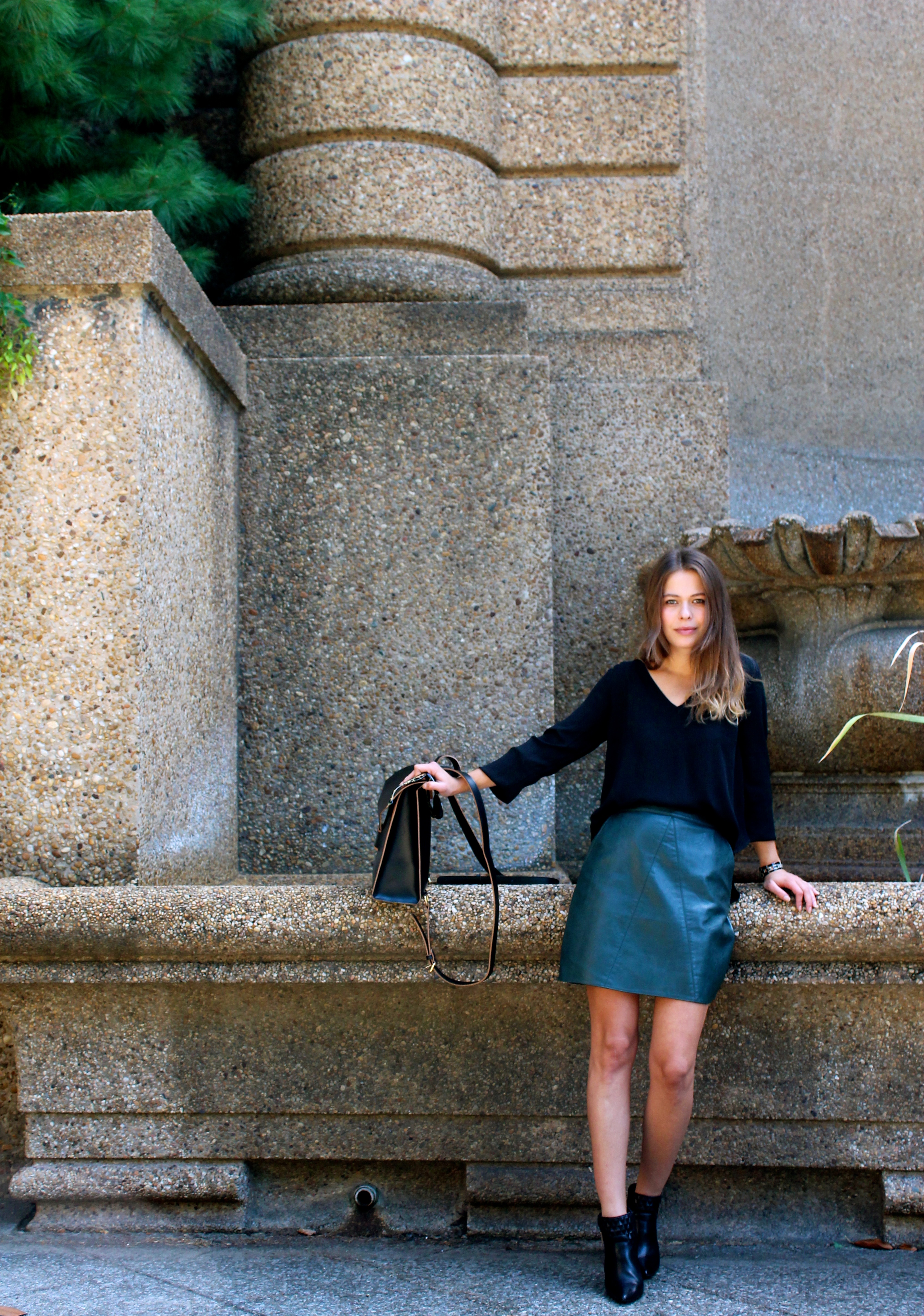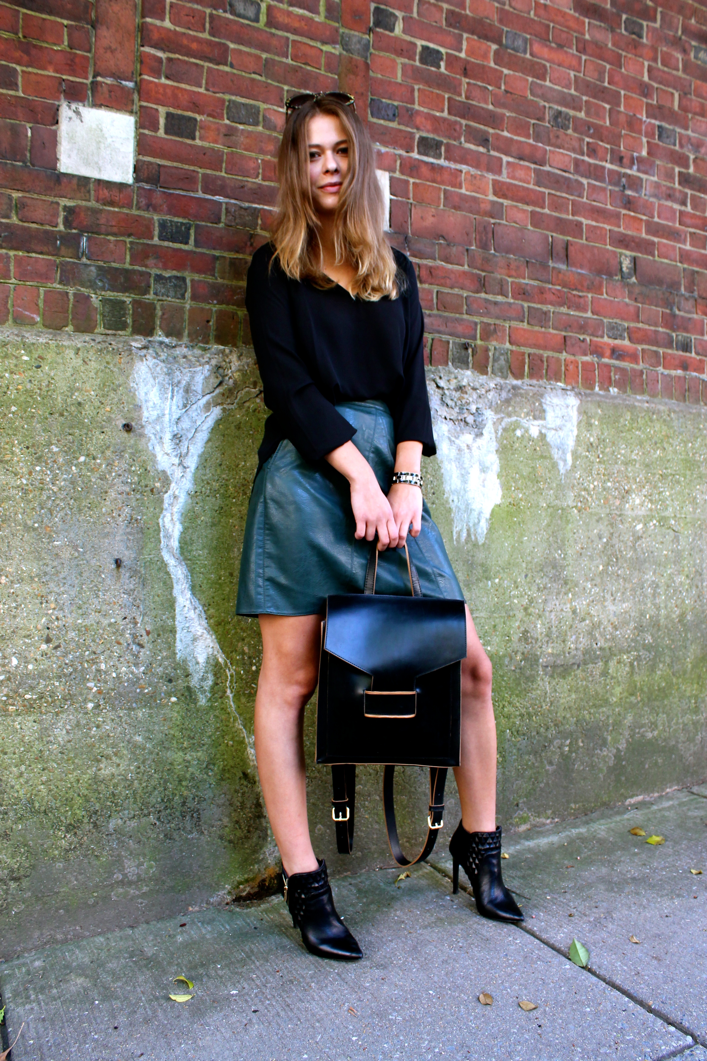 Lush Blouse || Zara Faux Leather Skirt || ASOS Leather Backpack || Dolce & Gabbana Sunnies|| BCBGeneration Booties